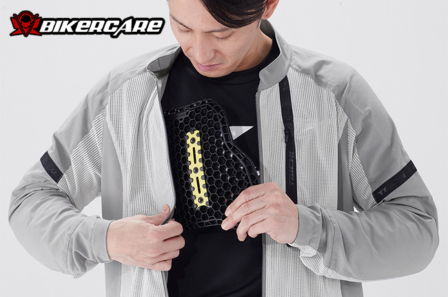 Có thể gắn thêm giáp ngực (chest protector – tùy chọn) thông qua hệ thống nút gắn bên trong áo. Các vị trí vai, khuỷu tay và lưng có thể nâng cấp lên protector chuẩn CE Level 2 (tùy chọn) để tăng khả năng bảo vệ khi chạy tốc độ cao hoặc đi tour đường dài.