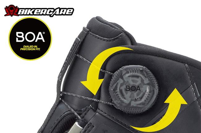 Hệ thống BOA® Fit System giúp điều chỉnh độ ôm của giày chỉ bằng một núm xoay, mang lại độ vừa vặn chính xác và thao tác nhanh chóng. Người dùng có thể dễ dàng điều chỉnh ngay cả khi đang mang găng tay riding.