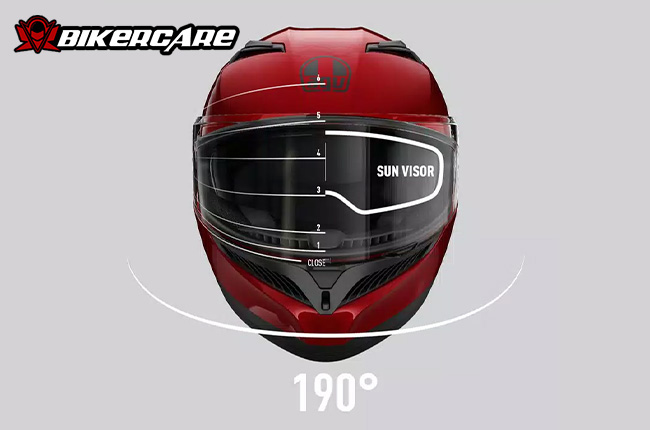 Kính chắn có 6 nấc điều chỉnh giúp bạn có thể điều chỉnh luồng không khí bên trong mũ theo nhu cầu của mình. Có hệ thống Extra Quick Release System giúp thay đổi tấm kính mũ dễ hơn. Thêm vào đó, thiết kế thêm kính âm chắn nắng chống tia UV.