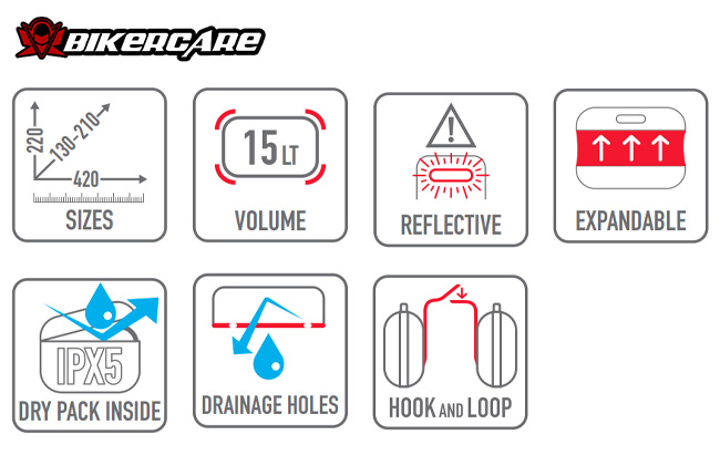 Dung tích 15 lít có thể mở rộng: đủ để đựng mũ bảo hiểm mỏng, áo mưa, hoặc các vật dụng cần thiết khác.