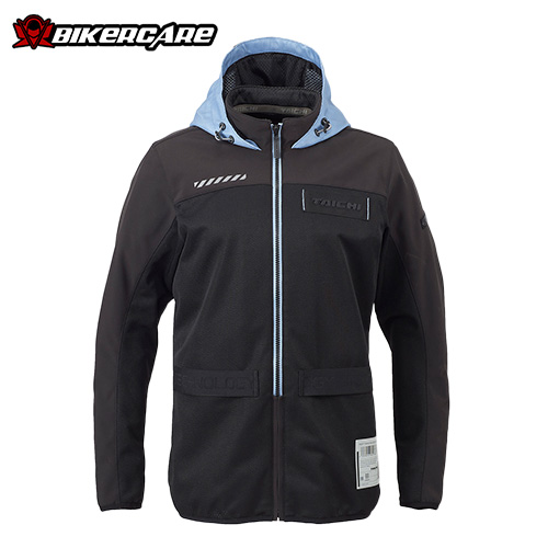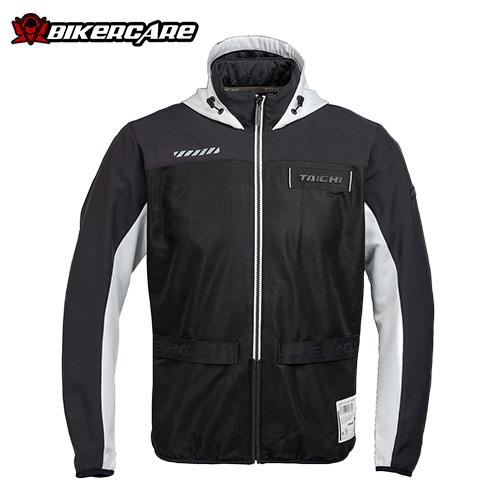 Phần nón được thiết kế trên áo giáp Taichi RSJ 334 có thể cuộn gọn lại phía sau, phù hợp việc di chuyển tốc độ cao, vòng eo và cổ tay áo được may bằng chất liệu thun co giãn.