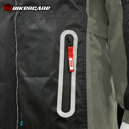 Viền phản quang với logo Givi phản quang ở trước áo, sau áo, cánh tay giúp người mặc an toàn khi di chuyển vào ban đêm.