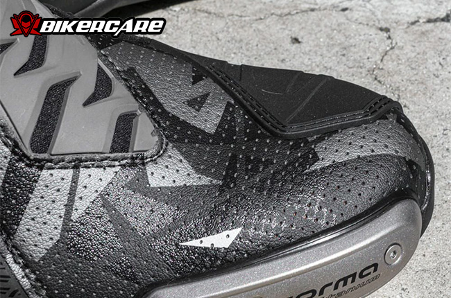 - Mặt ngoài tích hợp hệ thống Cambric phía trước với thiết kế khung xương (Skeletal Design) cho phép đôi giày uốn cong tự nhiên khi gập gối đồng thời giữ độ ổn định cao trong các tình huống nghiên xe cực hạn.